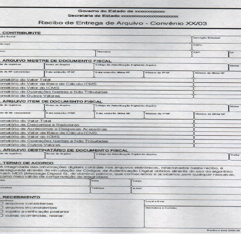 TÍTULO III 1. Apresentação: 1.1. Este manual visa orientar o procedimento de emissão de documentos fiscais, escrituração dos livros fiscais, manutenção e prestação de informações em meio eletrônico dos contribuintes do ICMS, que nos termos do Capítulo III-A deste Anexo, emitam em via única, um dos seguintes documentos fiscais: a) Nota Fiscal/Conta de Energia Elétrica, modelo 6; b) Nota Fiscal de Serviço de Comunicação, modelo 21; c) Nota Fiscal de Serviço de Telecomunicações, modelo 22; d) IV - outro documento fiscal relativo à prestação de serviço de comunicação ou ao fornecimento de energia elétrica, nos termos previstos em ato do Secretário da Fazenda. 2. Da emissão de documentos fiscais: 2.1. os contribuintes devem cumprir as seguintes disposições: 2.1.1. gravação das informações constantes nos documentos fiscais em meio óptico não regravável, o qual deve ser conservado pelo prazo decadencial, para disponibilização ao fisco, em substituição à 2ª via não emitida; 2.1.2. numerar os documentos fiscais em ordem crescente e consecutiva de 000.000.001 a 999.999.999, devendo ser contínua, sem intervalo ou quebra de seqüência da numeração; 2.1.3. calcular o código de autenticação digital do documento fiscal, utilizado para garantir a autenticidade do documento fiscal emitido e a integridade das informações mantidas em meio óptico não regravável, em substituição à 2ª via do documento fiscal não emitido; 2.1.3.1. o código de autenticação digital deve ser obtido pela aplicação do algoritmo MD5 (Message Digest 5, vide item 11.7.), de domínio público, na cadeia de caracteres formada pelos seguintes dados constantes dos documentos fiscais (conforme item 5.2.2.5.): a) CNPJ ou CPF do destinatário ou do tomador do serviço; b) número do documento fiscal; c) Valor Total; d) Base de Cálculo do ICMS; e) Valor do ICMS; 2.1.4. imprimir o código de autenticação digital obtido, de forma clara e legível com a seguinte formatação: 'XXXX.XXXX.XXXX.XXXX.XXXX.XXXX.XXXX.XXXX', em um campo de mensagem, identificado com a expressão 'Reservado ao Fisco', com área mínima de 12 cm2 a ser criado no documento fiscal. 3. Da manutenção e prestação das informações em meio óptico: 3.1. o contribuinte deve fornecer ao Fisco os documentos e arquivos de que trata este Manual, no dia 15 (quinze) de cada mês relativamente ao mês anterior, sem prejuízo de acesso imediato às instalações, equipamentos e demais informações mantidas em qualquer meio; 3.2. as informações devem ser mantidas e prestadas por meio dos seguintes arquivos: a) MESTRE DE DOCUMENTO FISCAL, com informações básicas dos documentos fiscais; b) ITEM DE DOCUMENTO FISCAL, com detalhamento das mercadorias ou serviços prestados; c) DADOS CADASTRAIS DO DESTINATÁRIO DO DOCUMENTO FISCAL, com as informações cadastrais do destinatário do documento fiscal; d) IDENTIFICAÇÃO E CONTROLE, com a identificação do contribuinte e resumo da quantidade de registros e somatório de valores dos arquivos acima referidos; 3.3. a apresentação dos arquivos deve ser acompanhada do Recibo de Entrega, conforme modelo do item 11.6, preenchido em 2 (duas) vias pelo estabelecimento informante, uma das quais deve ser devolvida ao contribuinte, como recibo, devendo conter as mesmas informações prestadas no arquivo de IDENTIFICAÇÃO E CONTROLE (itens 3.2, 'd' e 8). 4. Dados técnicos da geração dos arquivos: 4.1. meio óptico não regravável: 4.1.1. mídia: CD-R ou DVD-R, conforme o volume de documentos fiscais emitidos/mês: 4.1.1.1. CD-R - para contribuintes que emitam até 1 (um) milhão de documentos fiscais/mês; 4.1.1.2. DVD-R - para contribuintes com volume superior a 1 (um) milhão de documentos fiscais/mês; 4.1.2. formatação: compatível com MS-DOS; 4.1.3. tamanho do registro: 254 bytes para os arquivos MESTRE DE DOCUMENTO FISCAL, ITEM DE DOCUMENTO FISCAL e DADOS CADASTRAIS DO DESTINATÁRIO DO DOCUMENTO FISCAL e 766 bytes para arquivo CONTROLE E IDENTIFICAÇÃO, acrescidos de CR/LF (Carriage return/Line Feed) ao final de cada registro; 4.1.4. organização: seqüencial; 4.1.5. codificação: ASCII; 4.2. Formato dos Campos: 4.2.1. numérico (N), sem sinal, não compactado, alinhado à direita, suprimidos quaisquer caracteres não numéricos, com as posições não significativas preenchidas com zeros; 4.2.2. alfanumérico (X), alinhado à esquerda, com as posições não significativas em branco; 4.3. Preenchimento dos Campos: 4.3.1. numérico - na ausência de informação, o campo deve ser preenchido com zero. As datas devem ser preenchidas no formato ano, mês e dia (AAAAMMDD); 4.3.2. alfanumérico - na ausência de informação, o campo deve ser preenchido com brancos; 4.4. Geração dos Arquivos: 4.4.1. os arquivos devem ser gerados mensalmente, contendo apenas as informações referentes aos documentos fiscais escriturados na apuração do ICMS do mês. Em razão da grande quantidade de informações a serem apresentadas, os arquivos devem ser divididos em volumes contendo 100 (cem) mil documentos fiscais, caso sejam apresentados em CD-R ou volumes contendo 1 (um) milhão de documentos fiscais, caso sejam apresentados em DVD-R. Assim, se determinado contribuinte emitir 4.513.091 Contas de Energia Elétrica, modelo 6, em determinado mês, o contribuinte deve apresentar as informações referentes aos documentos fiscais emitidos em DVD-R, conforme critério do item 4.1.1., devendo os arquivos, previstos no item 3.2, serem gerados em 5 (cinco) volumes, com os quatros primeiros contendo informações de 1 (um) milhão de documentos fiscais e o último contendo as informações dos 513.091 documentos fiscais restantes; 4.5. Identificação dos Arquivos: 4.5.1. os arquivos devem ser identificados no formato: