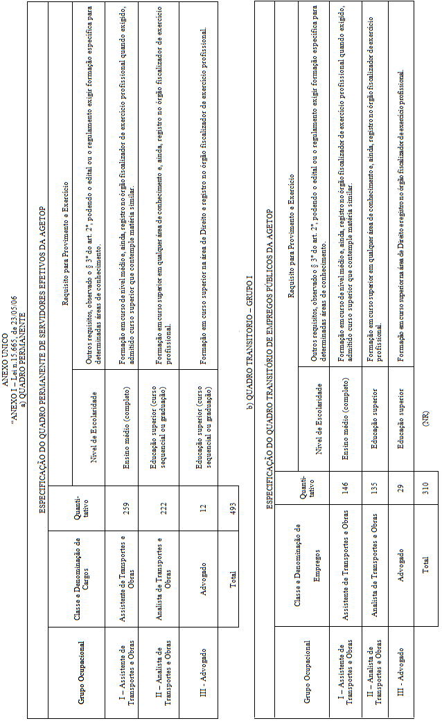 Introduz modificações na Lei nº 15.665, de 23 de maio de 2006, e dá outras providências. A ASSEMBLEIA LEGISLATIVA DO ESTADO DE GOIÁS, nos termos do art. 10 da Constituição Estadual, decreta e eu sanciono a seguinte Lei: Art. 1º Esta Lei altera a Lei nº 15.665, de 23 de maio de 2006, para nela incorporar disposições da Lei nº 17.088, de 02 de julho de 2010, e reestruturar o Plano de Cargos e Remuneração (PCR) do pessoal ativo da Agência Goiana de Transportes e Obras, definir os Grupos Ocupacionais dos Quadros Permanente e Transitório e os seus padrões de vencimentos e salários. Art. 2º A Lei nº 15.665, de 23 de maio de 2006, passa a vigorar com as seguintes alterações: “Art. 1º Fica criado o Quadro Permanente dos servidores efetivos da Agência Goiana de Transportes e Obras -AGETOP-, sob o regime estatutário, nos termos do Anexo I, alínea “a”, desta Lei e instituído o seu Plano de Cargos e Remuneração (PCR). ................................................................................................. § 2º............................................................................................ …............................................................................................... III – Revogado. …............................................................................................... Art. 2º ....................................................................................... I – Assistente de Transportes e Obras; II – Analista de Transportes e Obras; III – Advogado. .................................................................................................. Art. 3º........................................................................................ I – Assistente de Transportes e Obras: desempenho de atividades relacionadas com: a) apoio à execução de serviços técnicos e/ou administrativos, tais como: 1. controle e execução de serviços de almoxarifado, arquivo, compilação, seleção, organização, escrituração e registro de dados, operações ou informações de natureza fiscal, financeira, orçamentária, estatística, contábil e similares; 2. controle, instalação, manutenção, operação ou programação de computadores e outros equipamentos de informática, de comunicação e afins; 3. assistência ou execução direta de trabalhos ou projetos de edificação e outras obras de engenharia, bem como montagem, manutenção e reparos em prédios ou instalações públicas e, ainda, instalação e manutenção de quaisquer equipamentos, especialmente os elétricos, eletrônicos, mecânicos e similares; 4. secretariado e atendimento ao público; 5. recepção, catalogação, organização, produção de material audiovisual, arquivamento e conservação de acervos técnicos, jurídicos, administrativos, culturais e similares; b) assistência na execução e fiscalização de projetos e obras rodoviárias e civis, manutenção de rodovias e faixas de domínio, bem como reparos e consertos em prédios e equipamentos em geral, e, ainda: 1. elaboração de desenho técnico, orçamento, padronização, mensuração e controle de qualidade; 2. desempenho de atividades de ensino, pesquisa, análise, experimentação, ensaio, divulgação técnica e extensão, em suas áreas de conhecimento; c) condução e manutenção de veículos automotores; II – Analista de Transportes e Obras: desempenho de atividades de planejamento, organização, execução, direção, gerenciamento, supervisão, coordenação, assessoramento, consultoria, orçamento e controle de serviços técnicos e/ou administrativos, tais como: a) análise de processos ou procedimentos, sob os aspectos técnico, administrativo, operacional, financeiro, contábil e orçamentário; b) organização, consolidação e atualização de normas, jurisprudências e produção de outros materiais similares de interesse do serviço; c) pesquisa, elaboração, coordenação, execução e controle de projetos nas áreas de: administração geral; análise de sistemas; atuária; biblioteconomia; ciências sociais; contabilidade; economia; estatística; informática; jornalismo; relações públicas; secretária-executiva; serviço social; bem como outras áreas ou disciplinas afins; d) desempenho de atividades de gerenciamento, de fiscalização ou execução de projetos de obras públicas; e) elaboração de mapas e relatórios técnicos; f) realização de estudos topográficos, de controle tecnológico e de geoprocessamento; g) elaboração, análise e supervisão de projetos de arquitetura e engenharia das obras civis e avaliações prediais; h) elaboração e supervisão de projetos rodoviários e avaliações de rodovias; i) elaboração e supervisão de projetos e serviços específicos de engenharia mecânica, engenharia elétrica, rede lógica, fundação, estrutura metálica e concreto, drenagem, hidrosanitário e incêndio; j) planejamento e orçamento de obras civis e rodoviárias; III – Advogado: desempenho das seguintes atividades: a) exercício de representação, extrajudicial e judicial, ativa e passiva da autarquia; b) assessoramento jurídico; c) elaboração de minutas de atos administrativos: normativos e negociais; d) patrocínio jurídico dos agentes dirigentes da entidade em face de atos que praticarem no exercício de suas atribuições; e) análise de processos e emissão de pareceres. Art. 3º-A Os cargos e empregos públicos de que tratam os arts. 2º e 7º, especificados no Anexo I, alíneas “a” e “b”, ficam estruturados por classes, identificadas pelas letras “A”, “B” e “C”, subdivididas nos seguintes padrões: I – Classe A: padrões I a V; II – Classe B: padrões I a IV; III – Classe C: padrões I a III. Art. 3º-B Fica estabelecido o Padrão I da Classe A como referência base para os seguintes grupos ocupacionais: I – Assistente de Transportes e Obras, com vencimento ou salário fix